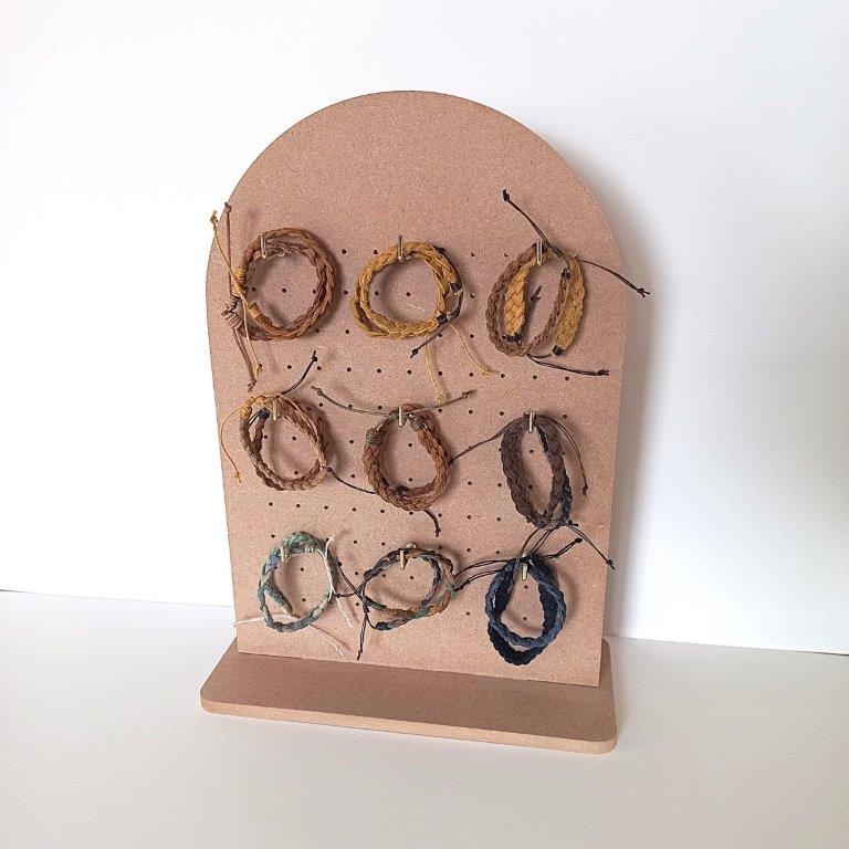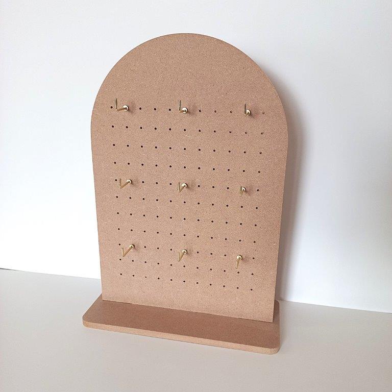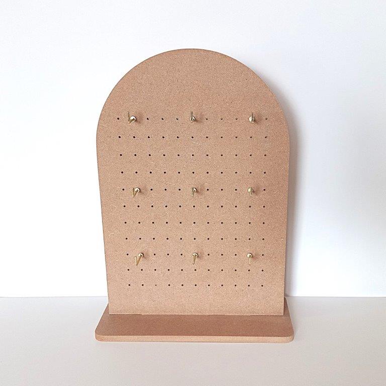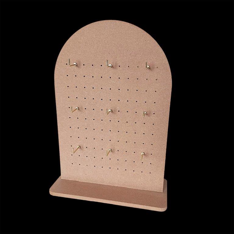 Small Tabletop Arch Pegboard Display stand made of MDF wood to showcase your products. The perfect size for retail shop counter tops and craft markets. Can be used for earring cards, necklaces, bracelets, keychains and other crafted items.